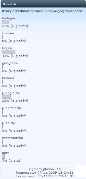 Zakończona została pierwsza ankieta. Pytanie brzmiało: "Który przedmiot sprawia Ci najwięcej trudności?". 43% głosów padło na fizykę, na drugim miejscu był j. angielski (29%), a na trzecim biologia (21%). Szczegółowe wyniki w dalszej części newsa.